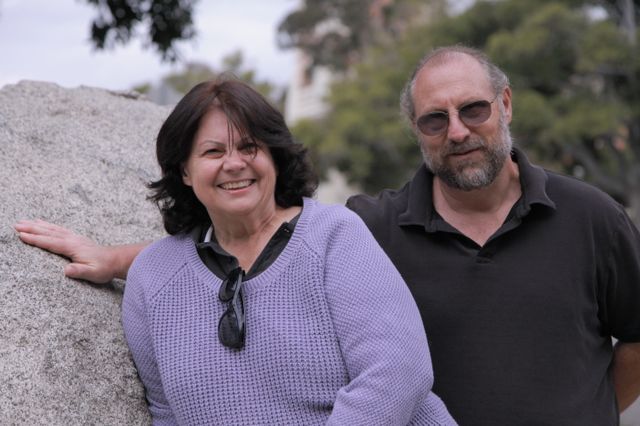 Angela Marciano and Dan Les of UCLA Housing and Hospitality Services stand in next to Founders' Rock.