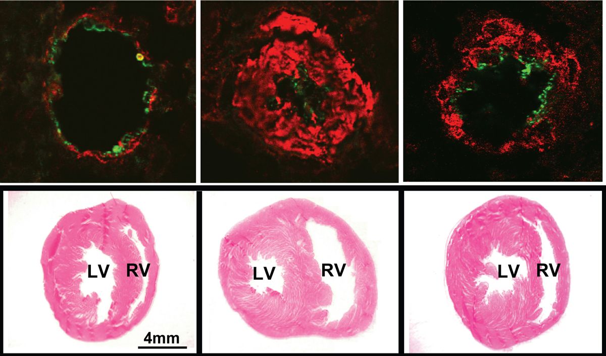 Small lung artery (top row) and heart (bottom) of rodents without disease (left); with pulmonary hypertension (center) and with disease treated with HDL peptide 4F (right). The animal with disease exhibits a very narrowed lung artery, and thick walls and larger chamber of the heart, all of which improved with treatment.