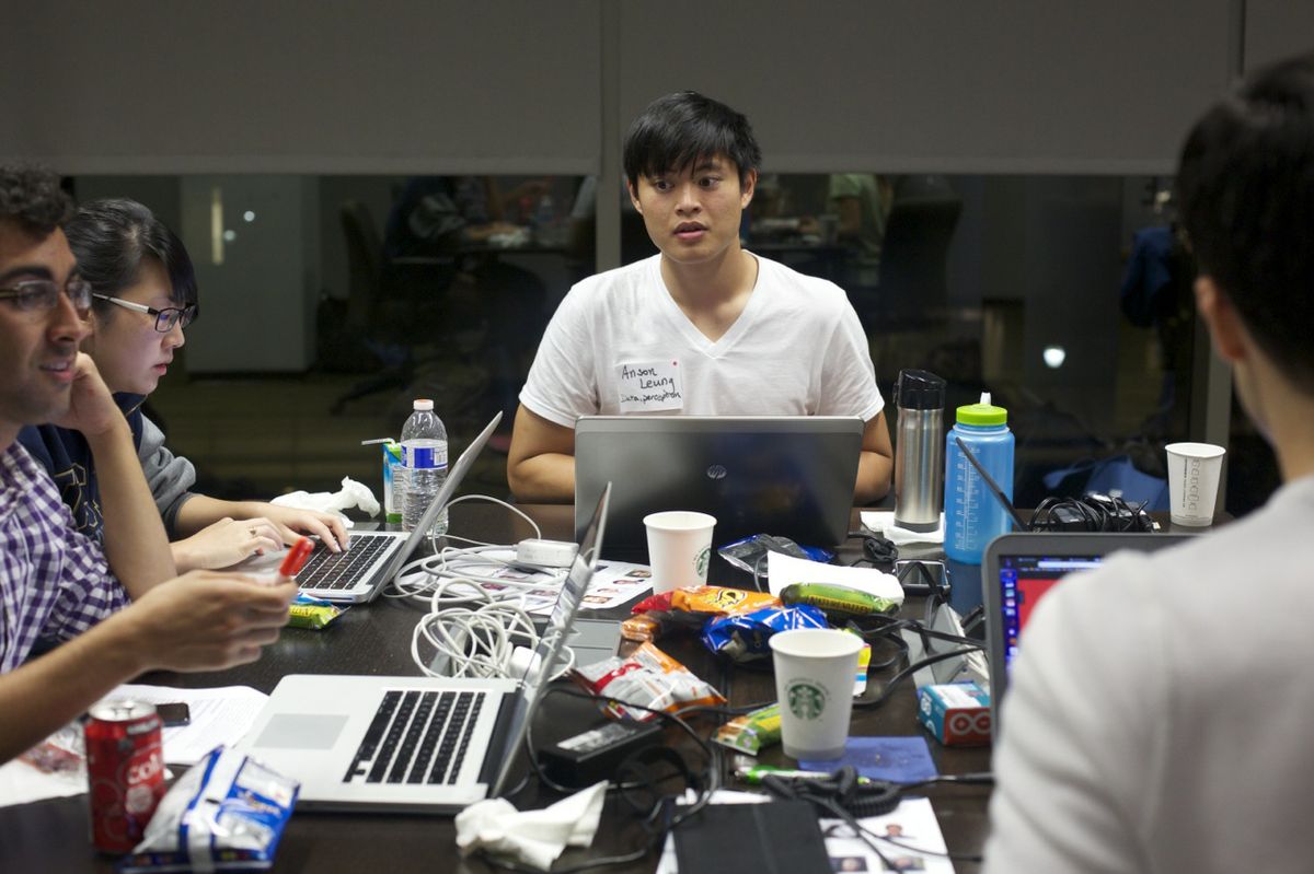 A team of UCLA students working on their project during the 2013 Inventathon competition. This UCLA Team included Reza Abasi, Mostafa Al-Alusi, Kristin Andreassen, Anson Leung and Joanne Zhang.