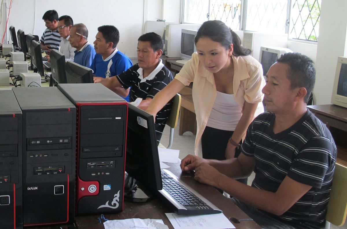 UCLA student Joan Hanawi works with teachers in a computer lab at a school in Pano, Equador.