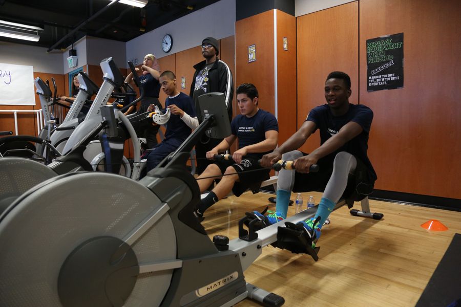 Students at East Valley High School workout on new equipment that was provided as part of a new program called UCLA Health Sound Body Sound Mind that gives under-resourced schools commercial-grade fitness equipment and an innovative curriculum designed to build students’ competence and confidence in a range of physical activities.
