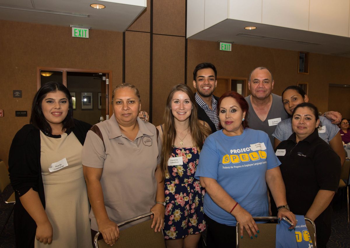 Project SPELL tutor Luzdelia Caballero (in floral dress) mentored Avelina Salcedo (blue T-shirt) and other program participants at graduation on June 5, 2015.