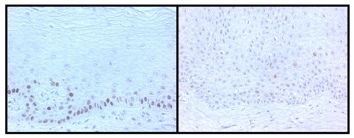 Staining for p53 protein in the oral gum tissues. The image on the left shows p53 staining from a 28-year-old patient and the image on the right is from a 74-year-old patient.