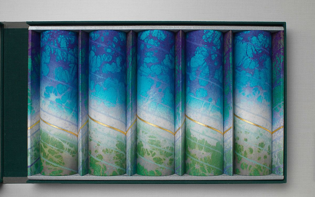 “Double Refraction: Turquoise,” 2005. Shigeki Fukumoto. Rōzome with fiber-reactive dye and gold leaf on linen cloth. Cotsen Collection, Photo by Bruce M. White © Lloyd Cotsen, 2016