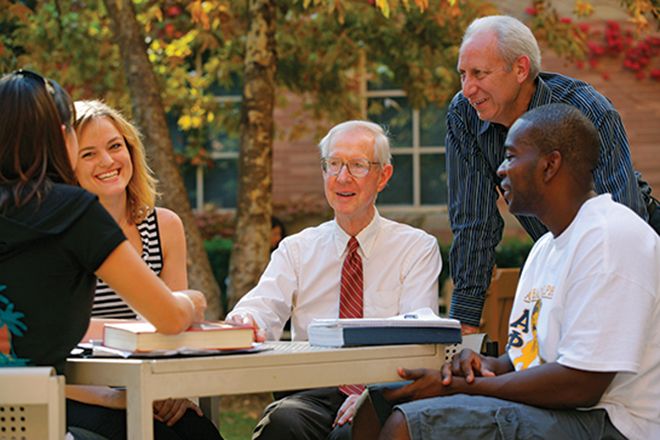 William Warren, center, with students and Jonathan Varat, dean emeritus and professor of law emeritus at UCLA Law.