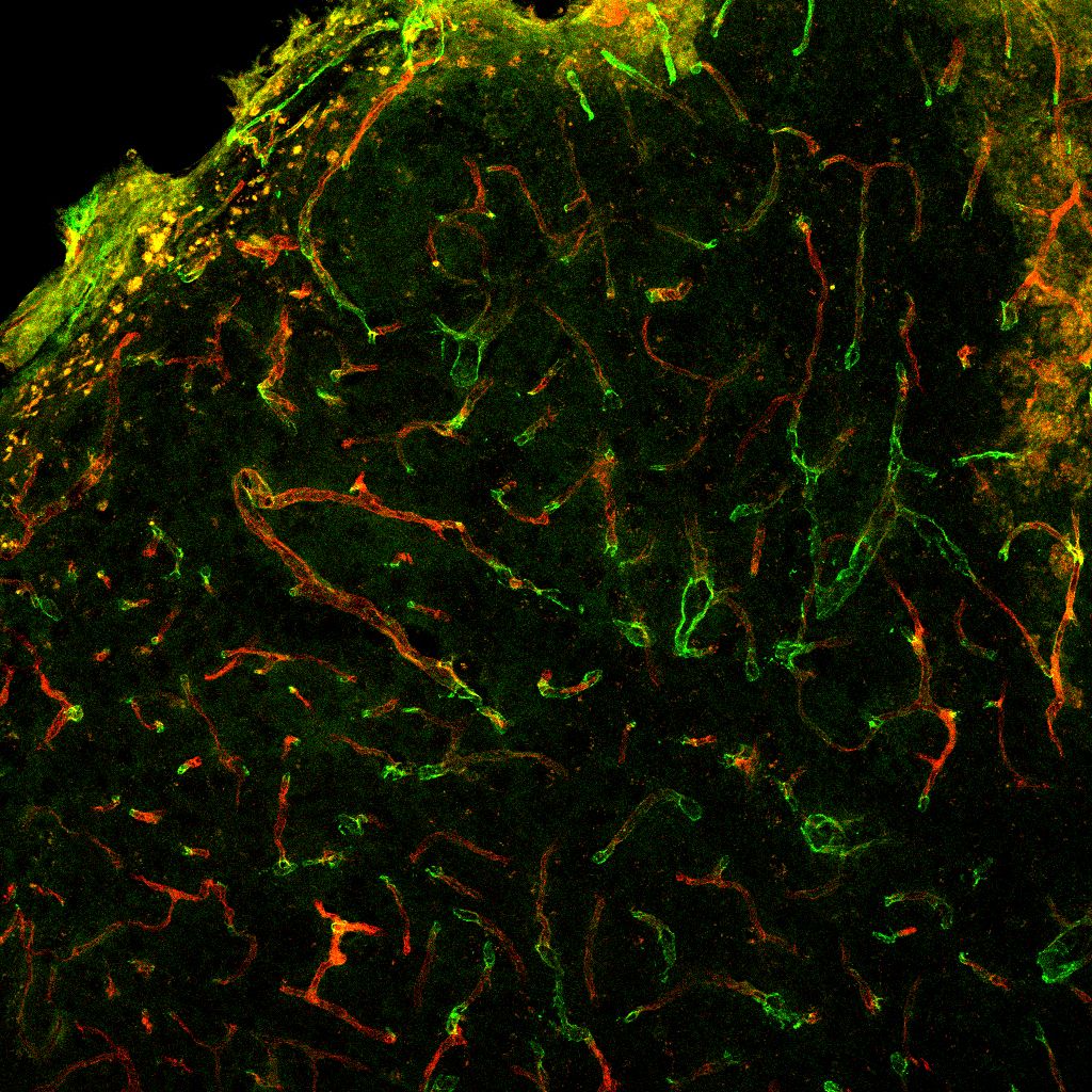 A fluorescence-enhanced microscope image showing healthy-looking blood vessels growth following stroke, in a mouse.