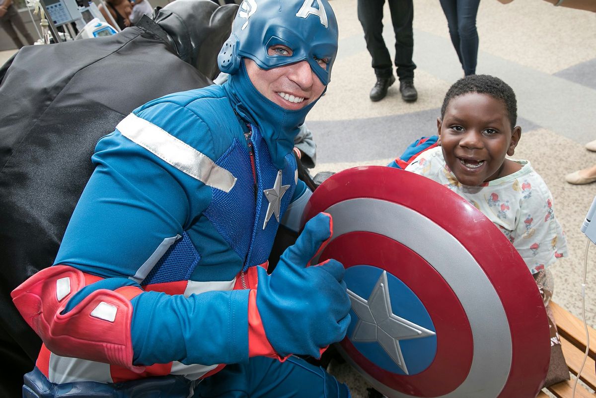 Captain America delights his new super partner, 7-year-old Tyrek Hanford, at UCLA Mattel Children’s Hospital.
