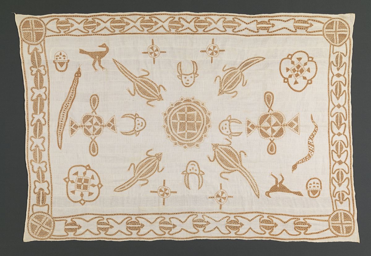 Artist Unknown (Bamum peoples, Cameroon) Tablecloth, early 20th century Cotton cloth, embroidery thread Fowler Museum at UCLA; Gift of Mary Hastings Bradley
