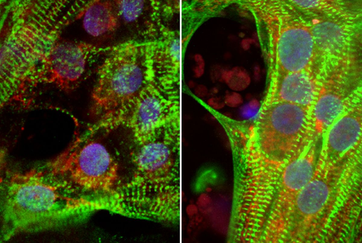 Human heart cells grown from stem cells show less-robust muscle fibers (green) in the presence of high levels of glucose (left) than when glucose levels were lower (right).