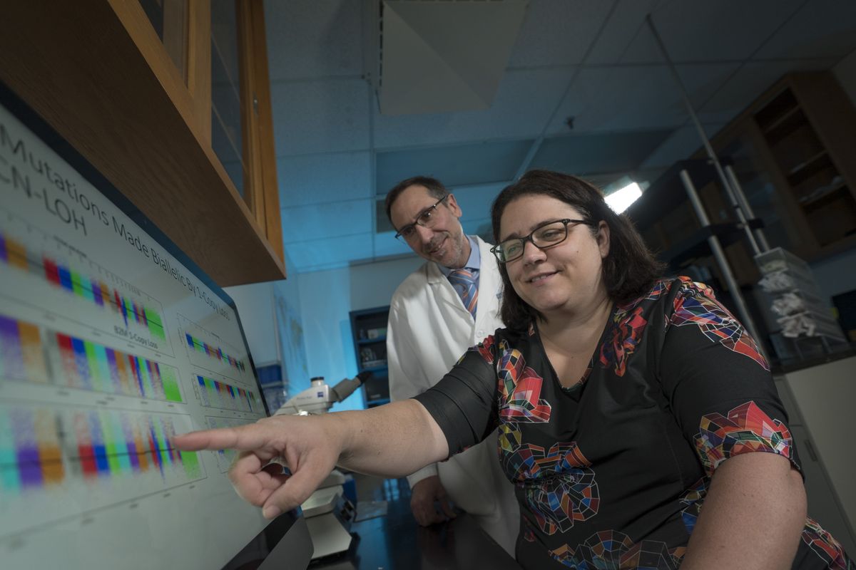 Catherine Grasso points to a genetic change in colon cancer that causes the cancer to no longer be recognized by the immune system.