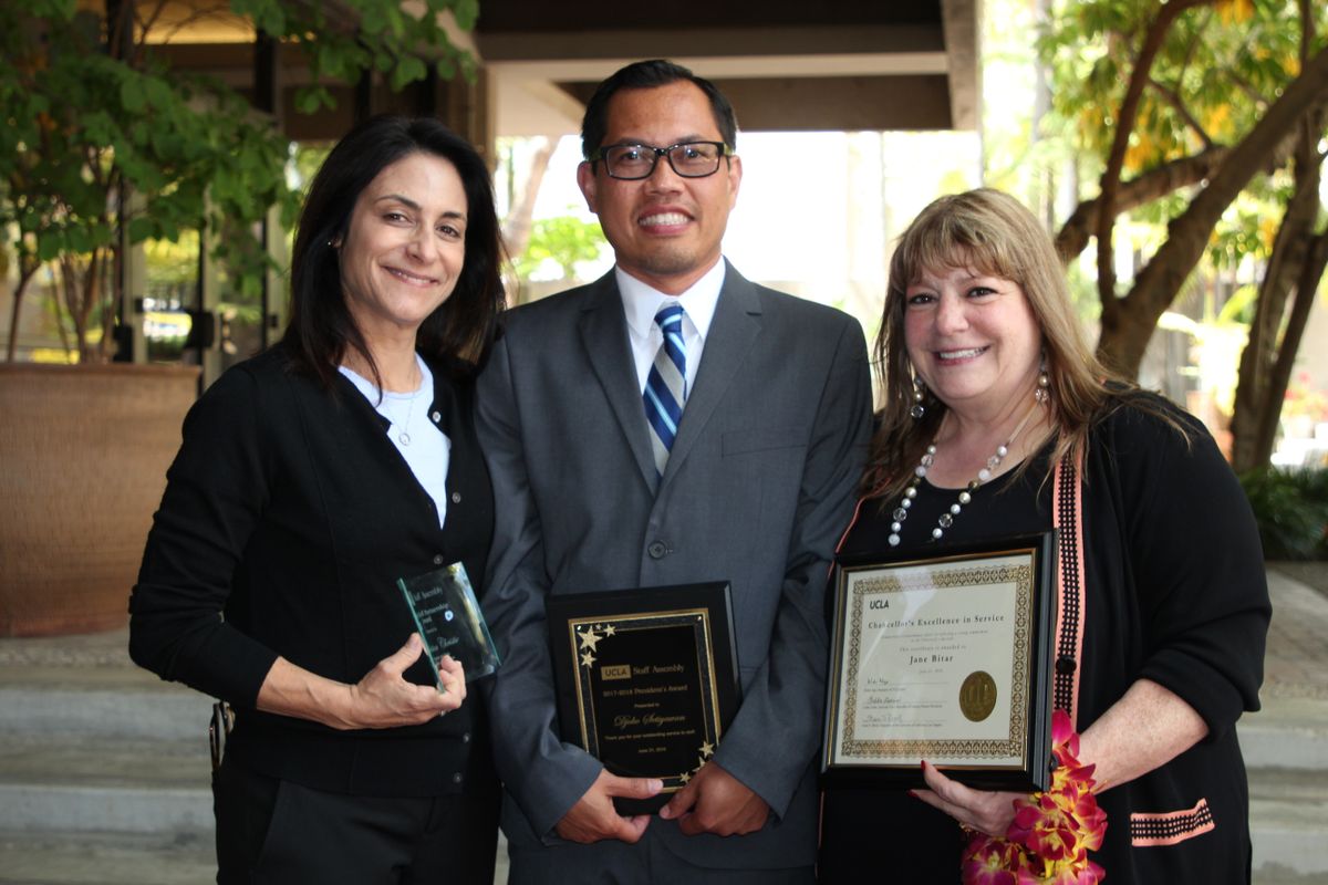 Professor Tina Christie, Djoko Setiyawan and Jane Bitar each received awards from the UCLA Staff Assembly. Angelo Magpantay, not pictured, also received an award.