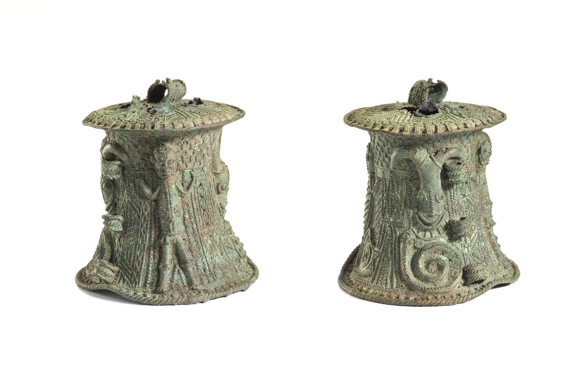Artist unknown (southern Nigeria). Bell, 20th century (?) (front and back views). Copper alloy. Promised gift of Mark Clayton. Image © Fowler Museum at UCLA. Photograph Don Cole, 2018.
