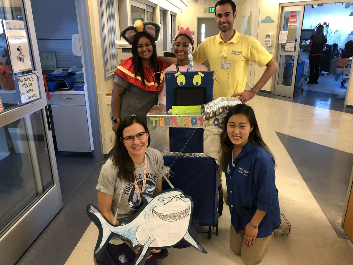 TreatBot 2.0, a robot made by Megan Pike (bottom left), helped patients who couldn't leave their rooms virtually trick-or-treat.