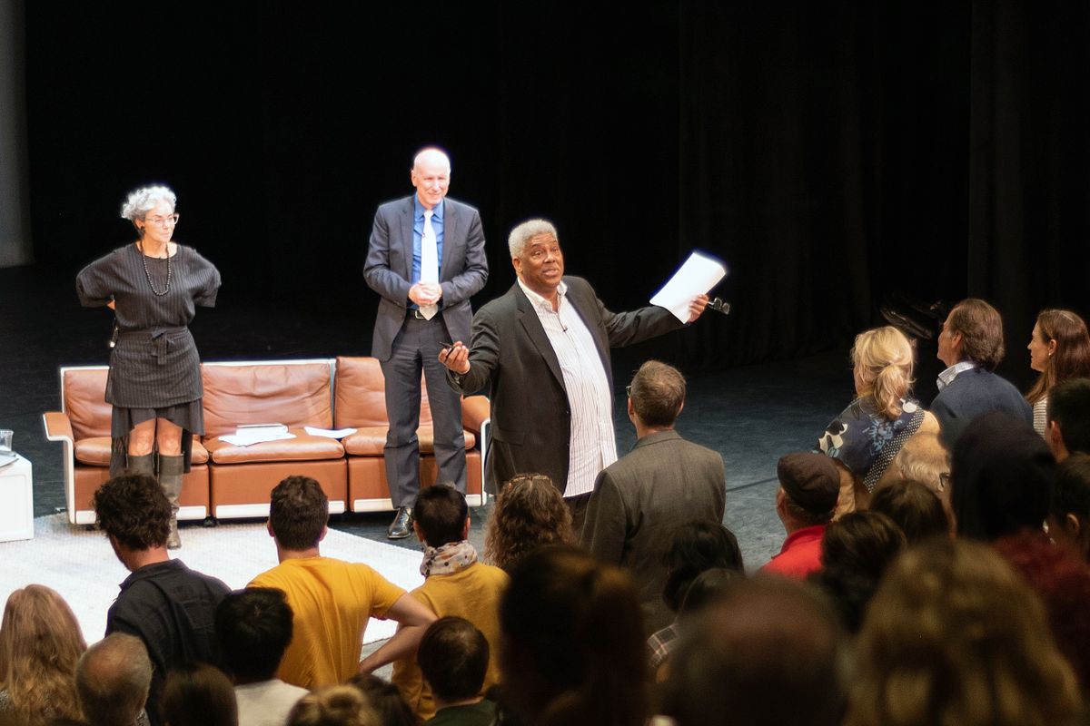 Rebeca Méndez, UCLA professor of design media arts, left, and Scott Waugh, executive vice chancellor and provost at UCLA, second from left, listen to composer and flutist James Newton share his ideas about what time is.