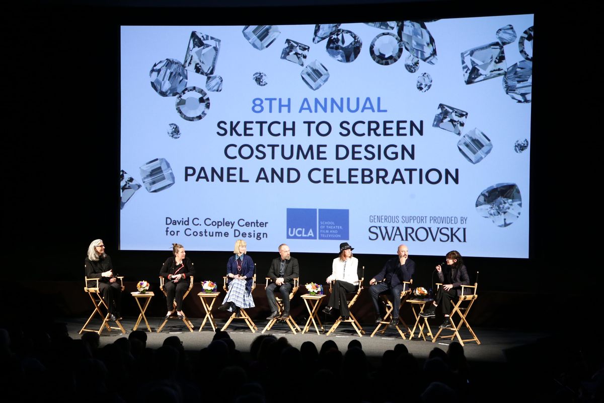 Deborah Nadoolman Landis, founding director of the David C. Copley Center for Costume Design, (far left) sits onstage with costume designer panelists during the 2018 Sketch to Screen event.