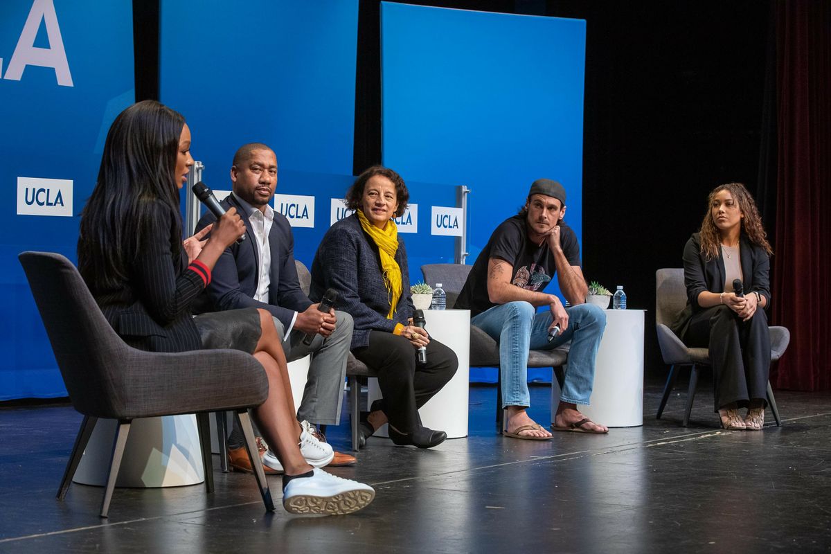 Panelists discussing the history of athletes and political activism. From left: Cari Champion, ESPN anchor and UCLA alumna; Damion Thomas, museum curator of sports for the Smithsonian National Museum of African American History and Culture who earned a doctorate in history from UCLA; Pat Turner, vice provost of UCLA undergraduate education and professor of African American studies; Chris Kluwe, a former punter for UCLA and the Minnesota Vikings, writer and LGBT activist; and Kaiya McCullough, UCLA women’s soccer player.