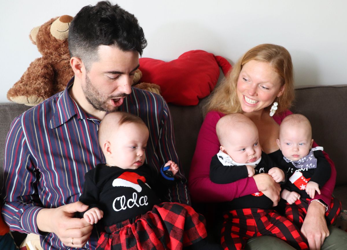 Gregor Martynus and Jana Gallus hold their healthy triplets. The babies spent 52 days in the neonatal intensive care unit after being born eight weeks early. Jana and Gregor were able to aid in the triplets’ care using a pacifier device that played a special lullaby that they wrote and sang for their babies.