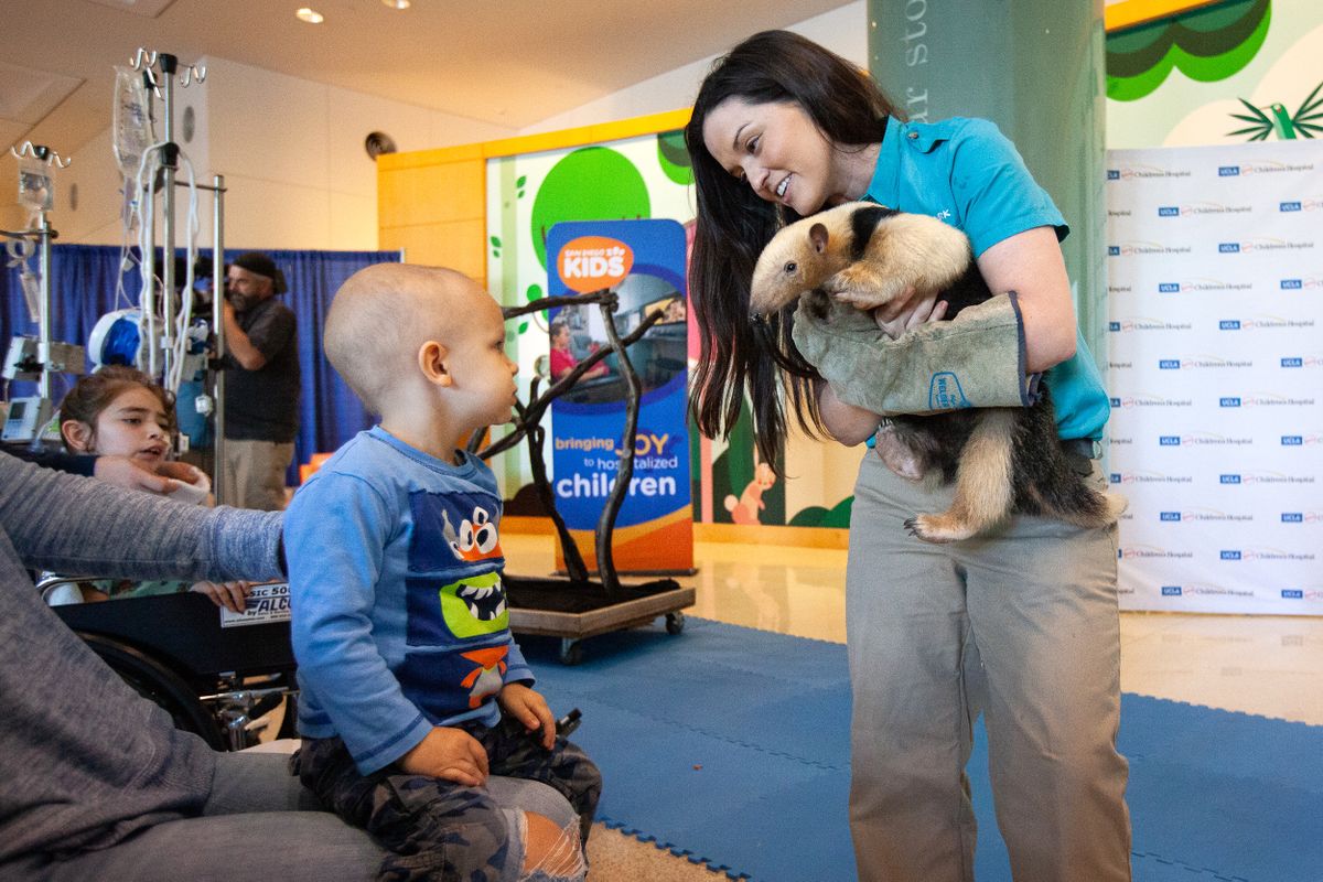 A tamandua from the San Diego Zoo visits kids at UCLA Mattel Children’s Hospital.