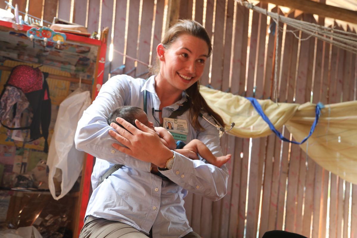 Medical student Molly Sprague cradles a newborn baby on a home visit in Iquitos, Peru.