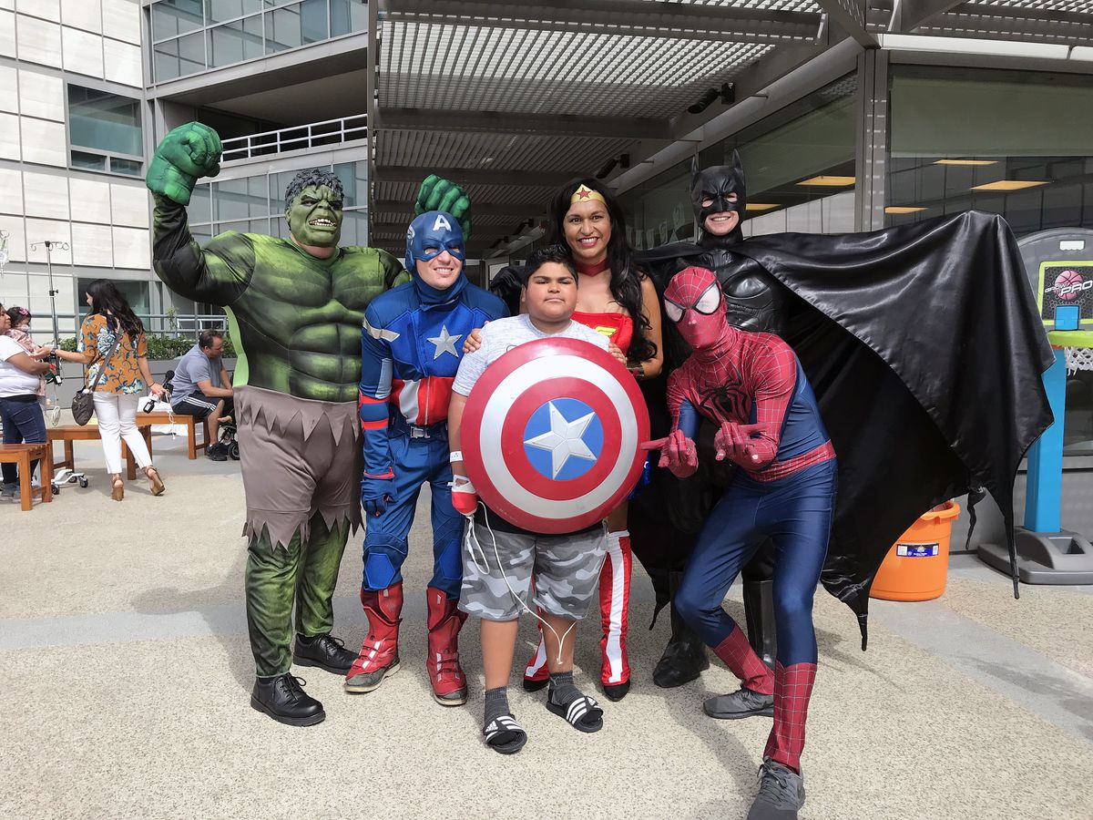 The Hulk, Captain America, Wonder Woman, Batman and Spider-Man team up to bring some smiles to children at UCLA Mattel Children’s Hospital for the annual superhero window washing day.