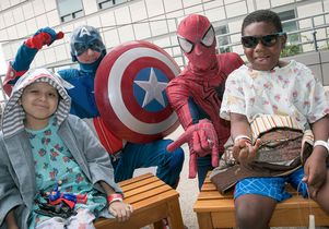 Window washers dressed as Batman, Captain America, Spider-Man, Wonder Woman and the Hulk descended from the roof of Mattel Children’s Hospital UCLA to greet patients.