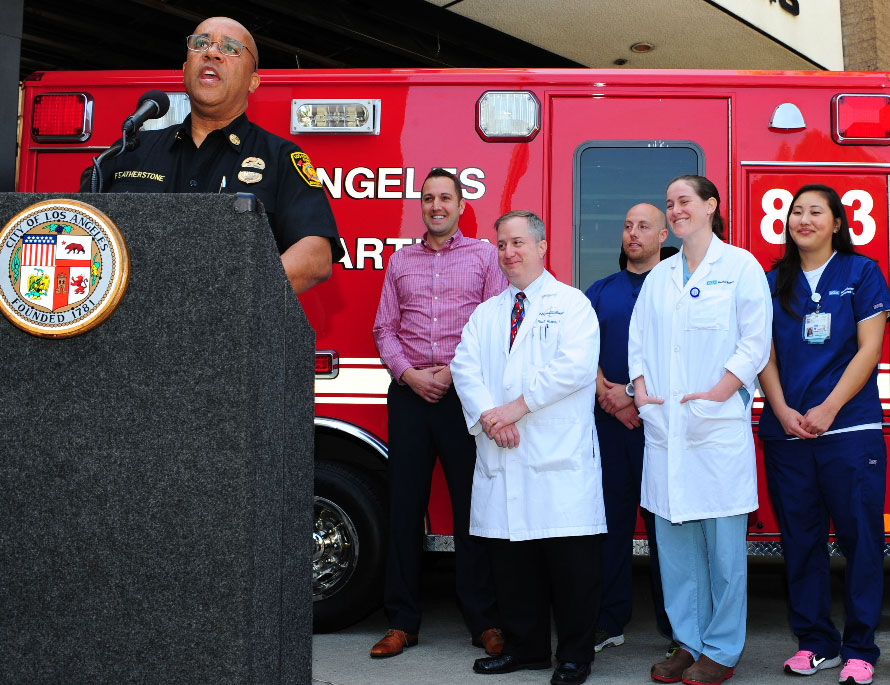 “The sheer number of pieces that had to fall into place to enable me to survive is staggering to imagine,” said Lebeda at today's reunion. “Words cannot describle the gratitude I feel for the trained volunteers and LAFD members who reacted instantly to save my life. Additionally, the expert care I received from Dr. Vespa and the rest of the UCLA medical staff following the marathon has allowed me to be here physically, just as I was before the race. This experience has been one of those life-altering events that will forever change my perspective on all things. The importance of first responders and human compassion in our society has never felt more real."