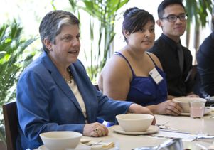 Napolitano joined first-year students in a seminar, discussed an array of issues with student leaders and met with faculty and senior administrators during her third visit to a UC campus since taking office less than two weeks ago.